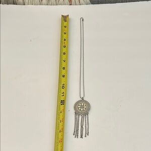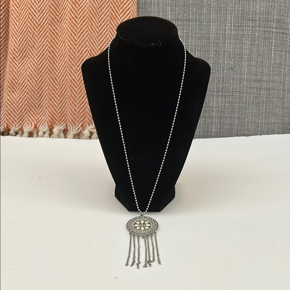 This elegant silver pendant necklace features intricate detailing and a timeless design. Perfect for adding a touch of sophistication to any outfit.