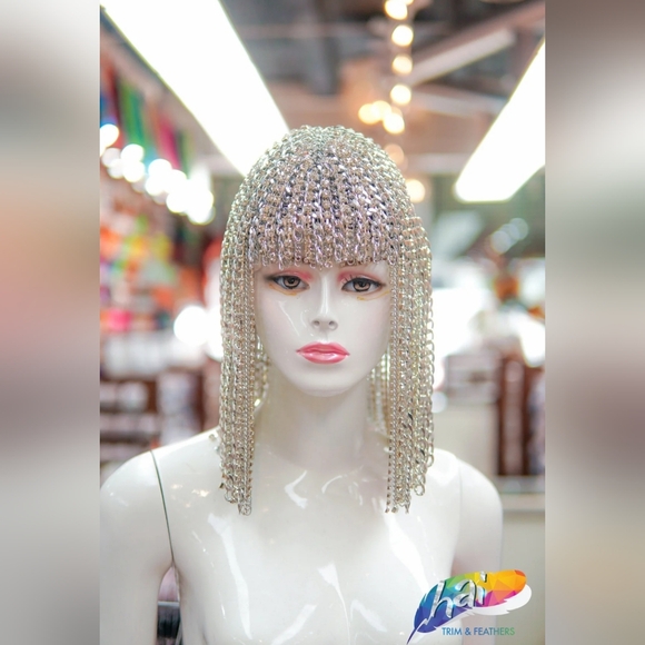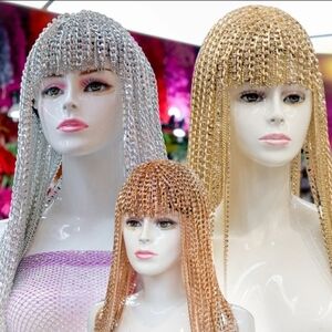 Silver wig. rhinestone headpiece cleopatra wig, cosplay wig burning man festival chain headpiece
