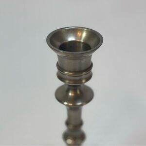 Chic and elegant silver candlestick with a soft satin finish. Felt bottom to protect your furniture.