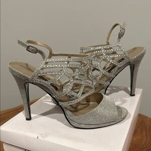 Gorgeous 4" heeled strappy sandals, size 9 . Very little wear, looks new. Worn once to an event for a couple of hours. box included.  Silver rhinestones and glitter.