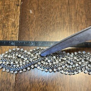 Note: although the photo shows a blue tone, that is a trick of the light. This is silver tone with crystal pieces.