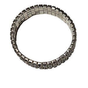 This bracelet features a 4-row design of sparkling rhinestones in a silver-tone setting. It is lightweight, stretchy, and suitable for versatile styling.