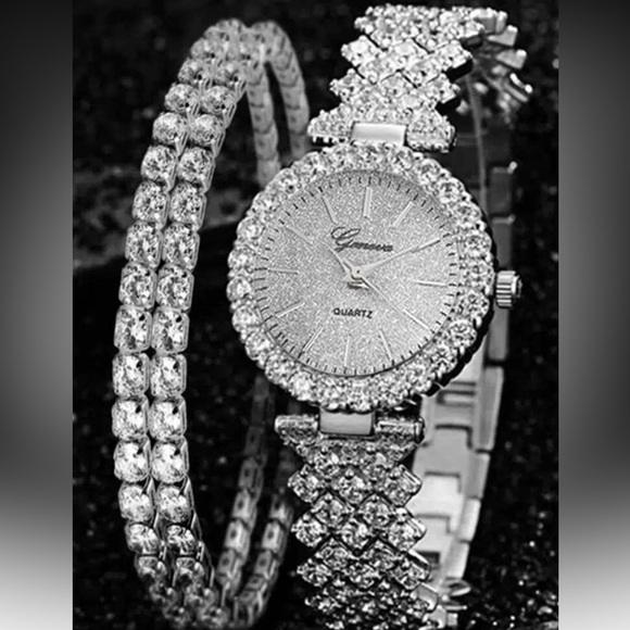 Elegant Silver Watch with Crystal Bracelet – 3 Piece Jewelry Set