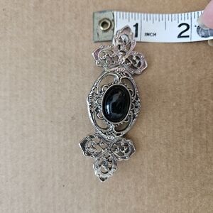 This elegant brooch features intricate silver detailing with a striking black centerpiece that looks similarto onyx. Perfect for adding a touch of sophistication to any outfit.