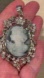 Beautiful silver and black cameo pendant with intricate detailing and clear rhinestones.
