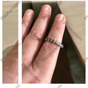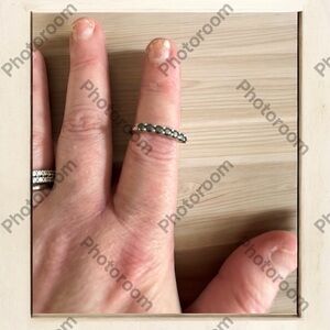 This elegant ring features a sleek silver band adorned with striking black stones, perfect for adding a touch of sophistication to any outfit.