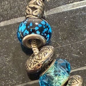 • Glass Beads: Several Murano-style glass beads in shades of turquoise and black with speckled and marbled patterns.