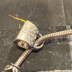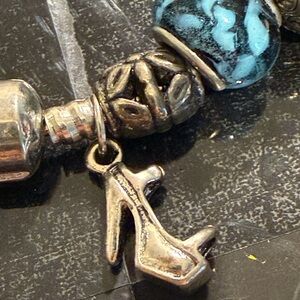 This is a charm bracelet, likely inspired by Pandora-style designs. The bracelet features a silver snake chain with a variety of beads and charms, including: