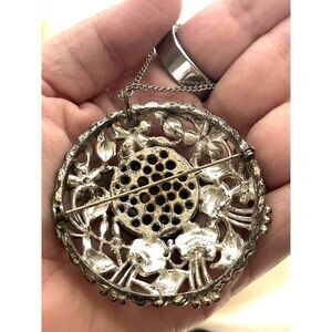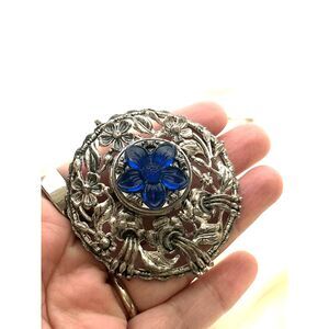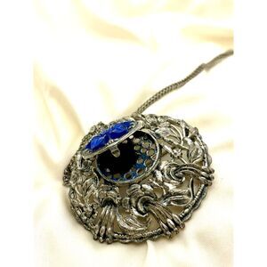 This exquisite necklace features a stunning blue floral design set against a silver backdrop, perfect for adding a touch of elegance to any outfit.