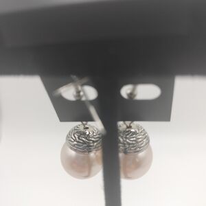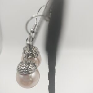 These elegant drop earrings feature a beautiful cream pearl accentuated by intricate silver detailing. Perfect for adding a touch of sophistication to any outfit.