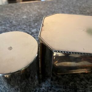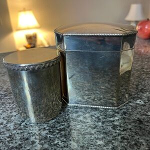 Enhance your home decor with these elegant silver with gold accent canisters. Perfect for adding a touch of sophistication to any room. Has markings on bottom. Smaller container has small dent. ( photo with pointer) does not take away from classic style.