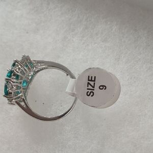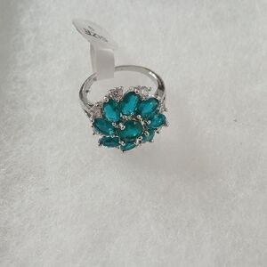 This stunning ring features vibrant green gemstones set in a sleek silver band. Perfect for adding a touch of elegance to any outfit. stainless steel with silver! hypoallergenic item.