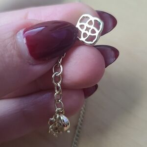 Gold and light green Elisa necklace. In good condition except for slight tarnishing on the charm on the chain shown in picture 2