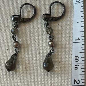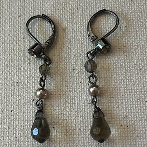 These beautiful dangle earrings feature smoky faceted teardrop beads, soft pearl accents, and subtle gunmetal-tone hardware for a vintage-inspired, moody elegance. Finished with secure leverback closures and perfect for both everyday wear and evening occasions.