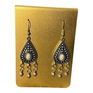 These elegant dangle earrings feature intricate silver detailing with a cream accent, perfect for adding a touch of sophistication to any outfit.