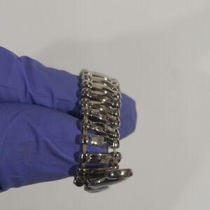 The Elegant Silver Tone Mustache Design Stretch Ring is a quirky yet stylish piece of women's fashion jewelry. Crafted with a polished silver-tone finish, this ring features a playful mustache design on an adjustable stretch band, ensuring a comfortable fit for various finger sizes. Perfect for adding a touch of fun to your outfit, this ring is a great conversation starter and a trendy accessory for casual occasions.