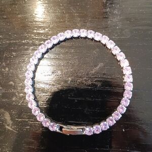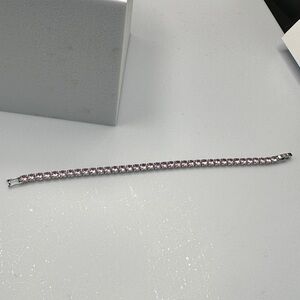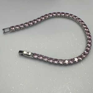 This stunning tennis bracelet features sparkling pink stones set in a sleek silver band. Perfect for adding a touch of elegance to any outfit.