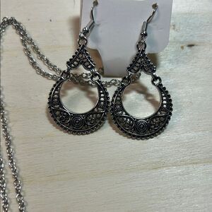 This elegant silver jewelry set features a beautifully crafted necklace and matching earrings. Perfect for adding a touch of sophistication to any outfit.