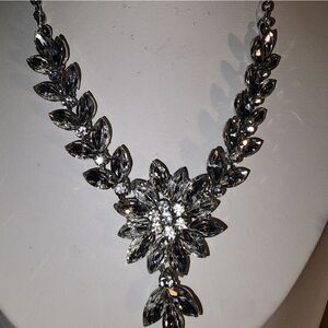 This stunning silver necklace features intricate crystal accents, perfect for adding a touch of elegance to any outfit.