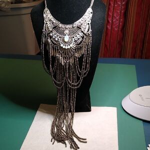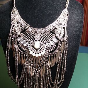 Elegant Silver Statement Bib Necklace Rhinestones and Chain Dangles