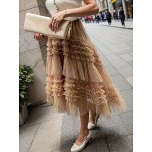 [Elegant Skirt] Polyester Elegant Layered Mesh High-Low Skirt | Solid Color, Mac