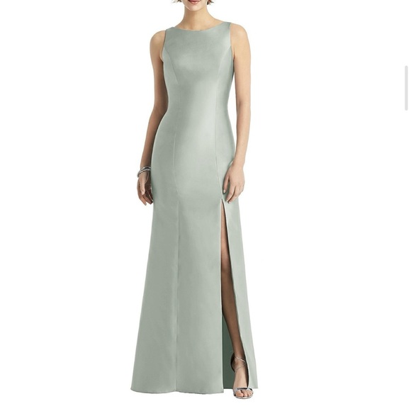 Alfred Sung d770. Willow green color, bow back. Full length sleeveless satin twill dress with bateau neckline and low square back. bow detail at back. trumpet skirt with slit at side front. Never worn