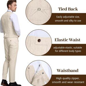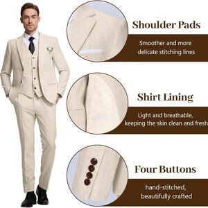 Features: This stylish linen suit combines comfort and sophistication with a slim fit silhouette that's great for any formal occasion. It includes a jacket, vest, and pants, making it a versatile choice for weddings, parties, or holiday gatherings. The breathable linen blend feels cool and luxe, perfect for warmer weather events.