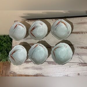 Set of six ceramic bowls. Features a delicate leaf design. Perfect for serving or display.