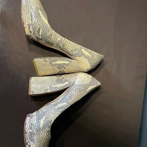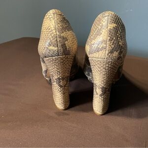 Classy peep toe snakeskin heels. Heel is a very cool triangle shape which gives these shoes a lot of personality. Just what you need to jazz up your closet! Heel is approximately 4” with a 3/4” platform.
