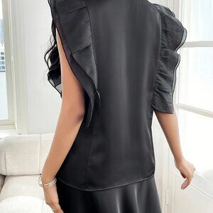 🟡 Elegant Solid Black Blouse with Flutter Sleeves & Bow Tie Organza