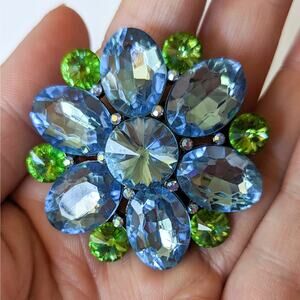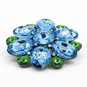 This exquisite brooch features a captivating floral design with shimmering blue crystals at its center, beautifully complemented by smaller green accents. The prong-set stones in a silver-toned setting create a stunning three-dimensional effect, perfect for adding a touch of elegance to any ensemble.