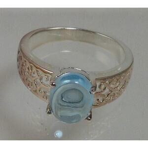 Add a touch of vintage charm to your jewelry collection with this stunning Sterling Silver Filigree Blue Topaz Ring. This ring features a beautiful 10mm x 8mm Blue Topaz cabochon round gemstone, set in intricate filigree sterling silver. The ring is a size 7 and weighs 3.4 grams.