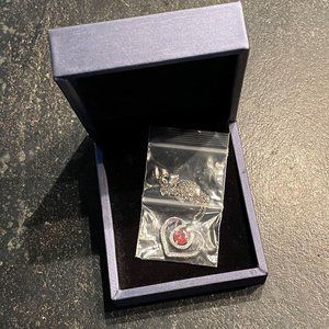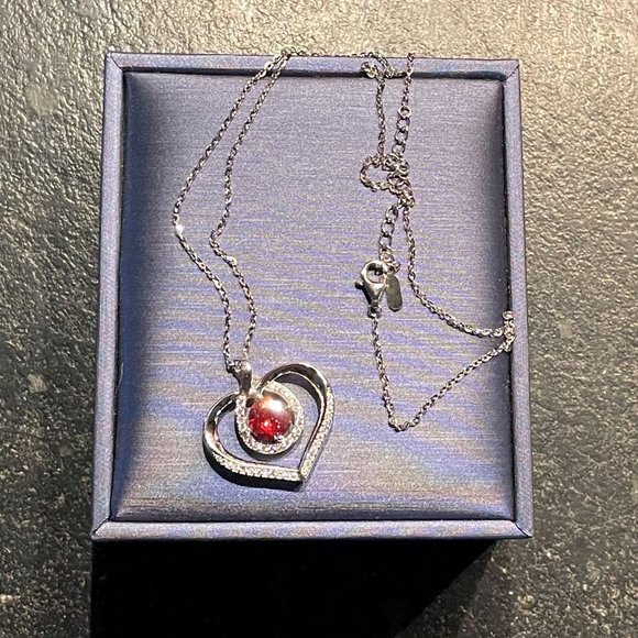 This beautiful heart pendant necklace is crafted from 925 sterling silver and cubic zirconia diamonds. Delicate yet sturdy silver chain, about 18 inches in length, with a lobster claw clasp. Although red is the January birthstone color, it would complement many wardrobes. It comes in a lovely box in case it is intended to be a gift. Or maybe to store it in for special occasions.
