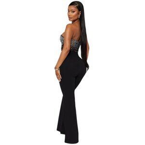 Fashion Nova Dream Girl Embellished Jumpsuit in Black. This elegant black strapless jumpsuit features a mesh top with partial lining and a back zipper. Same-day shipping for orders received on weekdays by noon CST. Make me an offer!