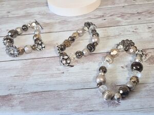 This set of three stretch bracelets features ornamental beads in chic shades of gunmetal gray, champagne, beige, and silver, accented with cubic zirconia for added sparkle.