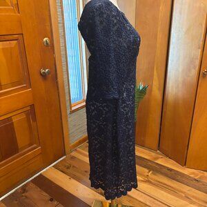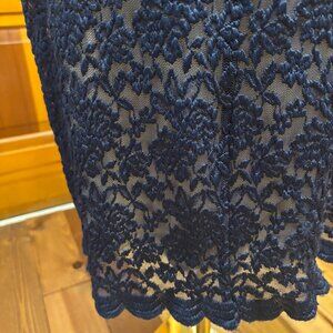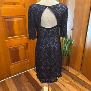 Elegant yet understated, this dress is a size 8, clean and in excellent condition. The lace fabric has a nice stretch to it making it a dress that will move with you. Knee length with 3/4" sleeves. Perfect for your special occasion. Size 8
