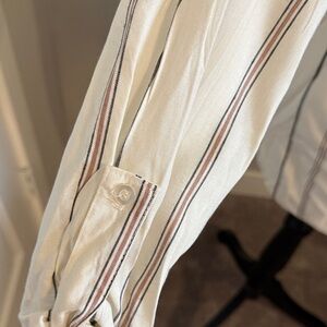 Discover timeless elegance with this striped button-down shirt. Crafted in a soft cream with striking blue stripes, it's perfect for both casual and formal settings. A versatile addition to any wardrobe.