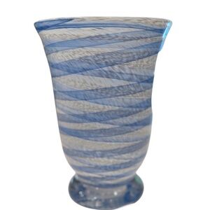 Enhance your home decor with this elegant glass vase, featuring a captivating blue and white swirl design.
