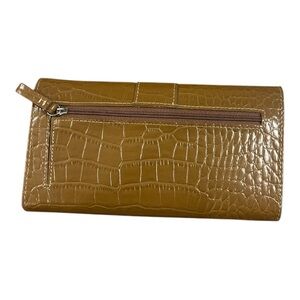 This stylish tan croc-embossed clutch is perfect for any occasion. Its sleek design and elegant color make it a versatile accessory.