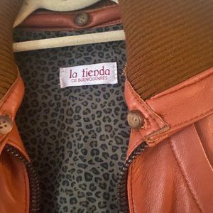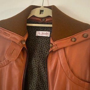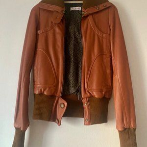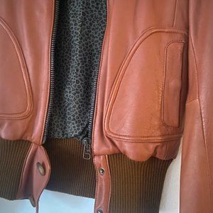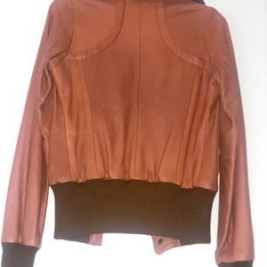 Stunning brown leather jacket. On trend, both in terms of color and elevated bomber cut with its special collar. Women's size Small.