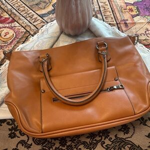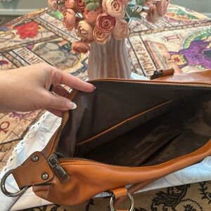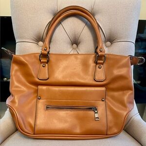 A chic medium‑sized tote with a sleek tan (cognac) leather or high‑quality faux‑leather exterior. It features sturdy rounded top handles, a zip‑top closure with metal hardware, and a front zip compartment for phones or small essentials. Inside, the bag is lined in a dark fabric and includes two open pockets and one small zip pocket—ideal for organization. The silhouette is softly structured with curved edges and moderate depth, making it versatile for everyday, work, or light travel use.