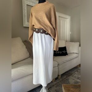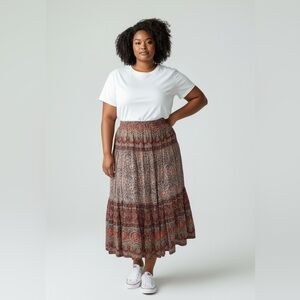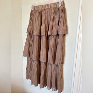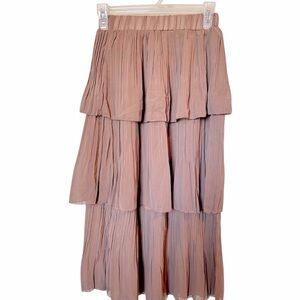 This elegant tan midi skirt features a tiered design, perfect for any occasion. Its soft fabric and flattering fit make it a must-have addition to your wardrobe.
