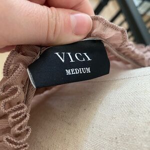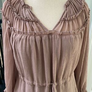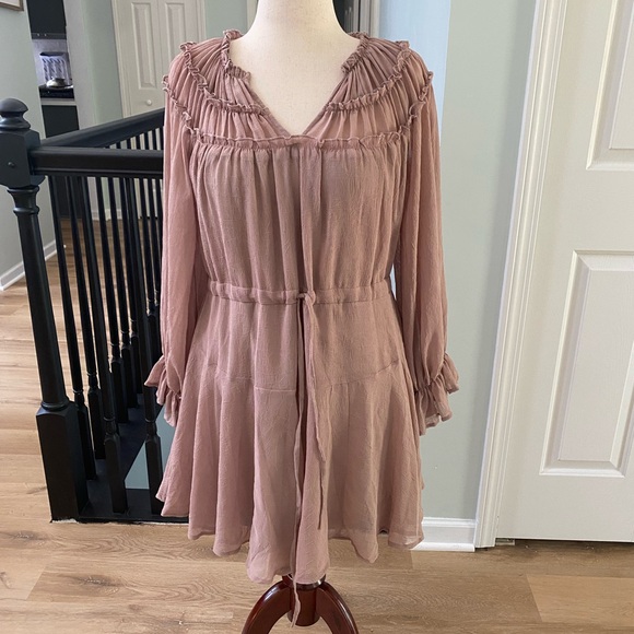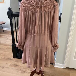 Chic tan dress with long sleeves. Features ruffle accents and a tie waist. Ideal for stylish outings.