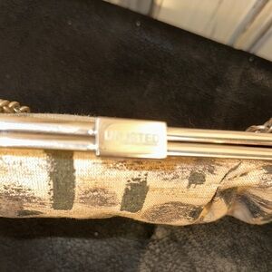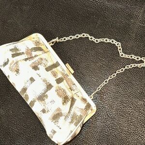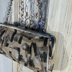 This stylish clutch features a chic tan and black design, perfect for any occasion. Its elegant chain strap adds a touch of sophistication.