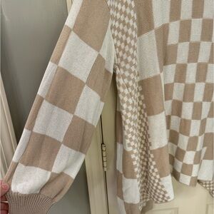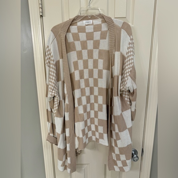 Elevate your wardrobe with this elegant tan and cream checkered cardigan. Perfect for adding a chic layer to any ensemble.