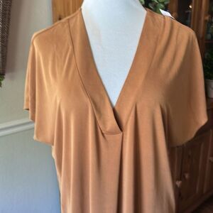 This elegant tan V-neck dress offers a relaxed fit and sophisticated style. Perfect for any occasion. Size Large