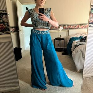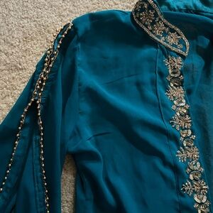 This elegant teal salwar suit features intricate embroidery, perfect for any special occasion. The rich teal color adds a touch of sophistication to your wardrobe.