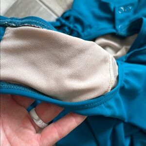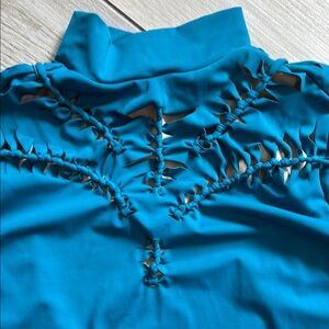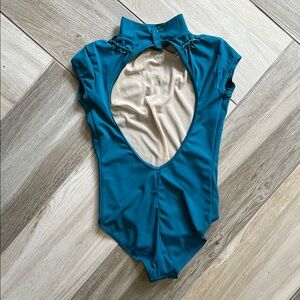 Chic teal leotard with a high neck and stylish ruched design. Ideal for dance or gymnastics. Some small pulls in the fabric - please see photos. Non-smoking home. Fast shipping!