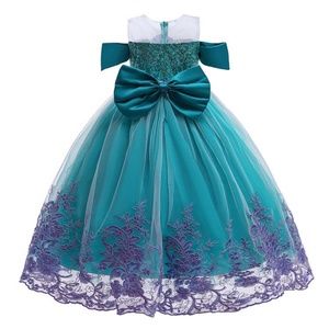 This stunning kids formal dress features a beautiful teal and purple design, perfect for special occasions. The elegant lace detailing adds a touch of sophistication.