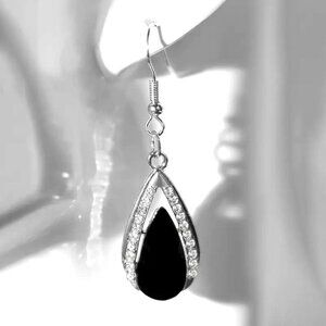 Elegant Teardrop Black Stone & Rhinestone Drop Dangle Earrings